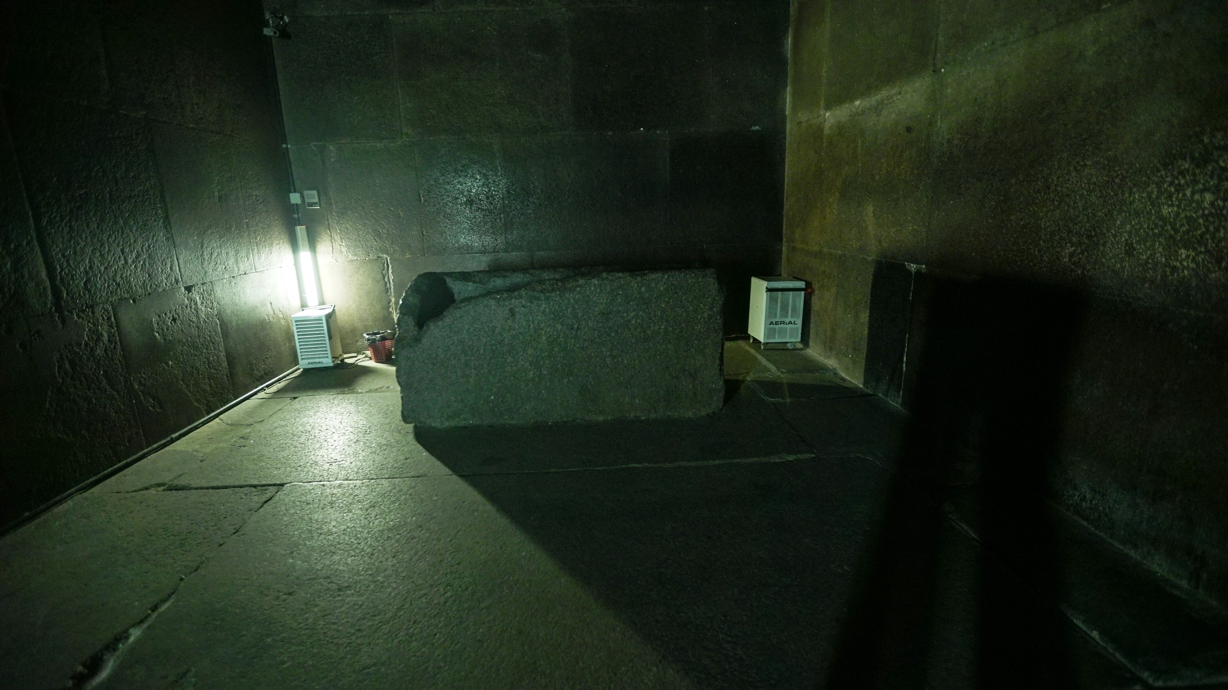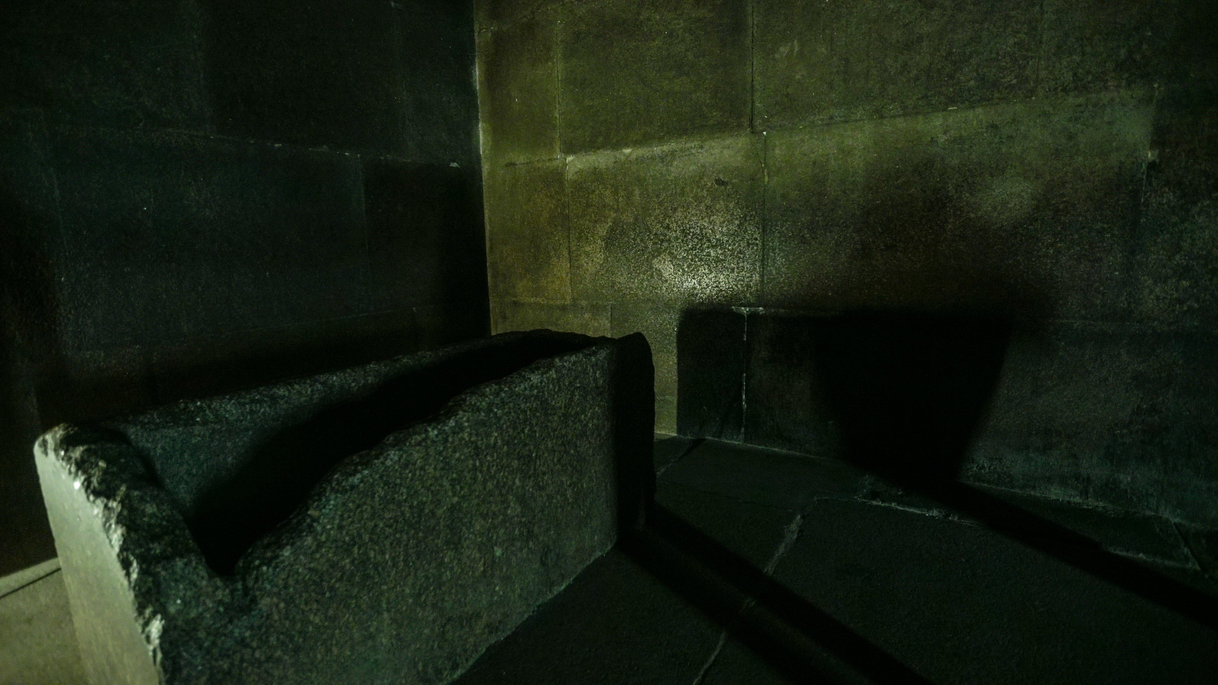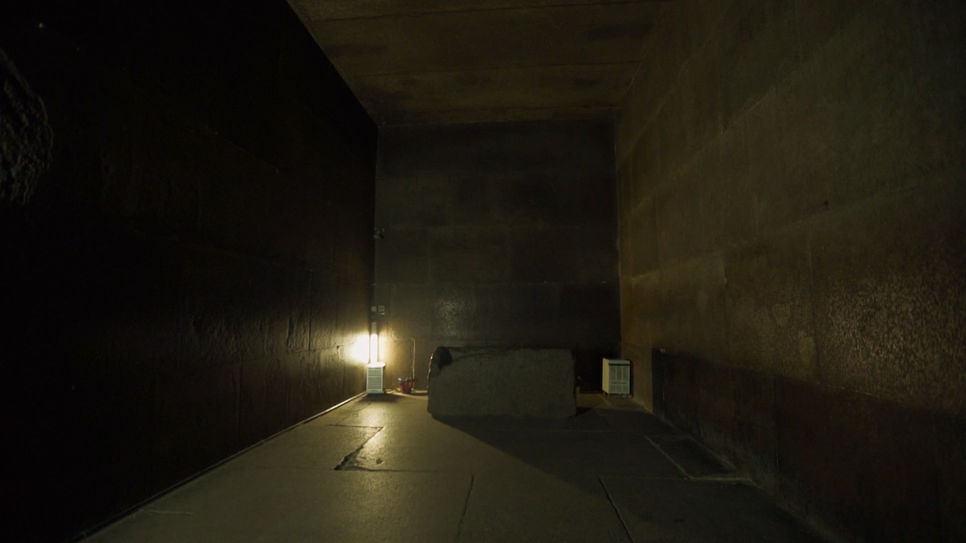 Bien qu’elle n’en ait pas l’air, cette pièce quadrangulaire représente, en vertu du poids des blocs qui la composent, une extraordinaire prouesse technique qui défie la raison. Il faut gérer ce chantier en parallèle de celui des blocs de calcaire qui composent le corps de la pyramide. Pourquoi ? Le coffre, par exemple, est trop gros pour passer par les couloirs et passerait trop juste dans l’ouverture qui mène à cette chambre : il a donc fallu le placer avant d’élever les parois.