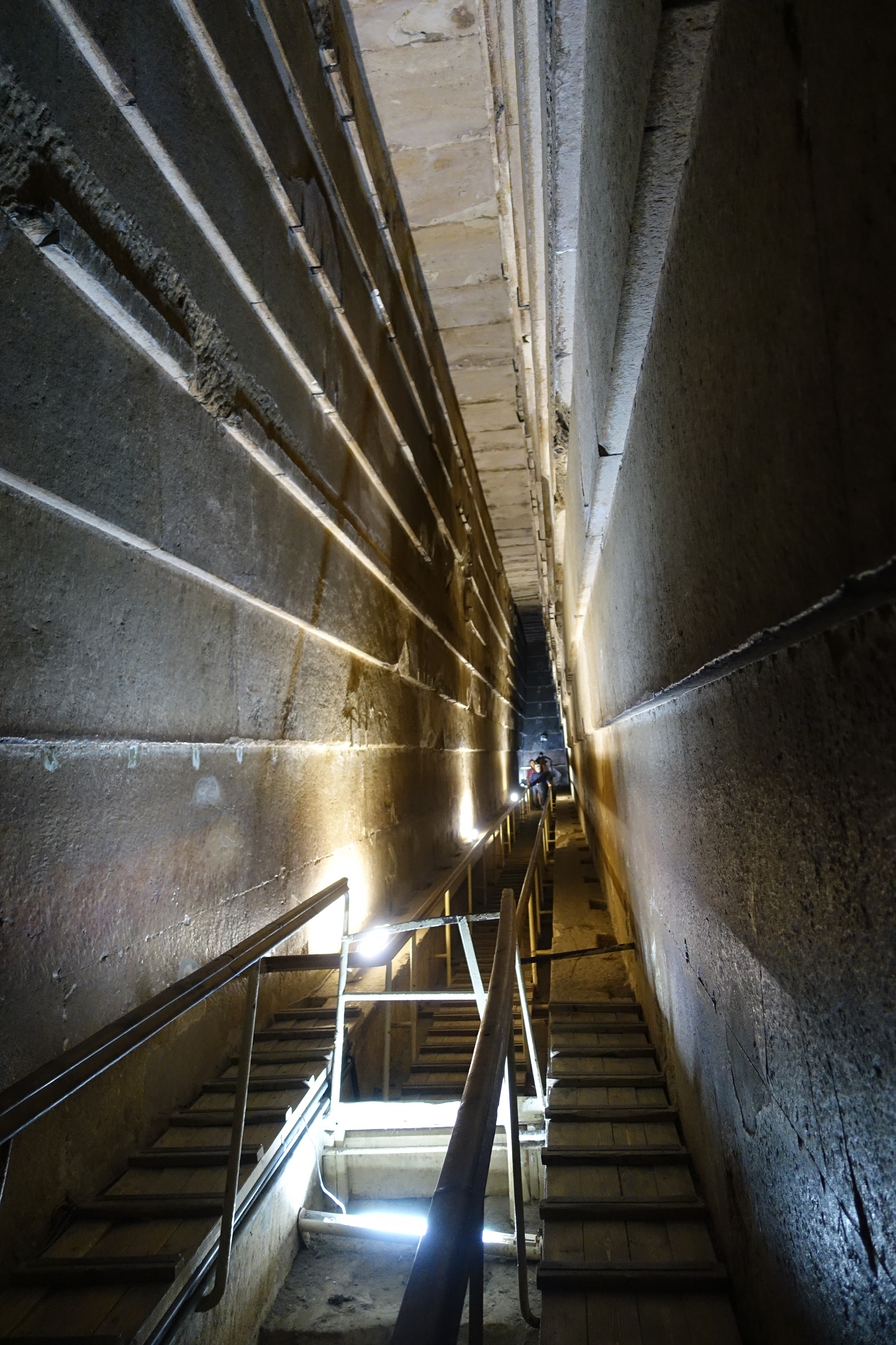 Dans ce couloir, devenu aujourd’hui l’accès principal touristique, on remarque qu’une fois dépassé les blocs de parement extérieurs parfaitement ajustés, si les blocs des couches intérieures ne s’assemblent pas avec la même précision, on est loin du « tout venant » que l’on entend parfois, un peu comme si la Grande Pyramide avait été assemblée autour d’un tas de caillou. Ce qui sous-tend, pour Érik, « que les amas de pierres en interne, sans être pour autant bâclés, n’ont pas eu besoin d’être systématiquement collés les uns aux autres, peut-être pour donner plus de souplesse au bâtiment. Des écarts de près de 10 centimètres sont parfois visibles. Les seuls ajustages parfaits pour cette couche de pierre sont situées sur les parties horizontales des blocs dont les hauteurs des rangs sont toutes différentes, mais parfaitement horizontales et parallèles. En revanche, dès que l’on entre dans le domaine des salles, des corridors, des escaliers, à nouveau les ajustages sont impeccables, à ne pas réussir à mettre un bout de papier dans les joints ».