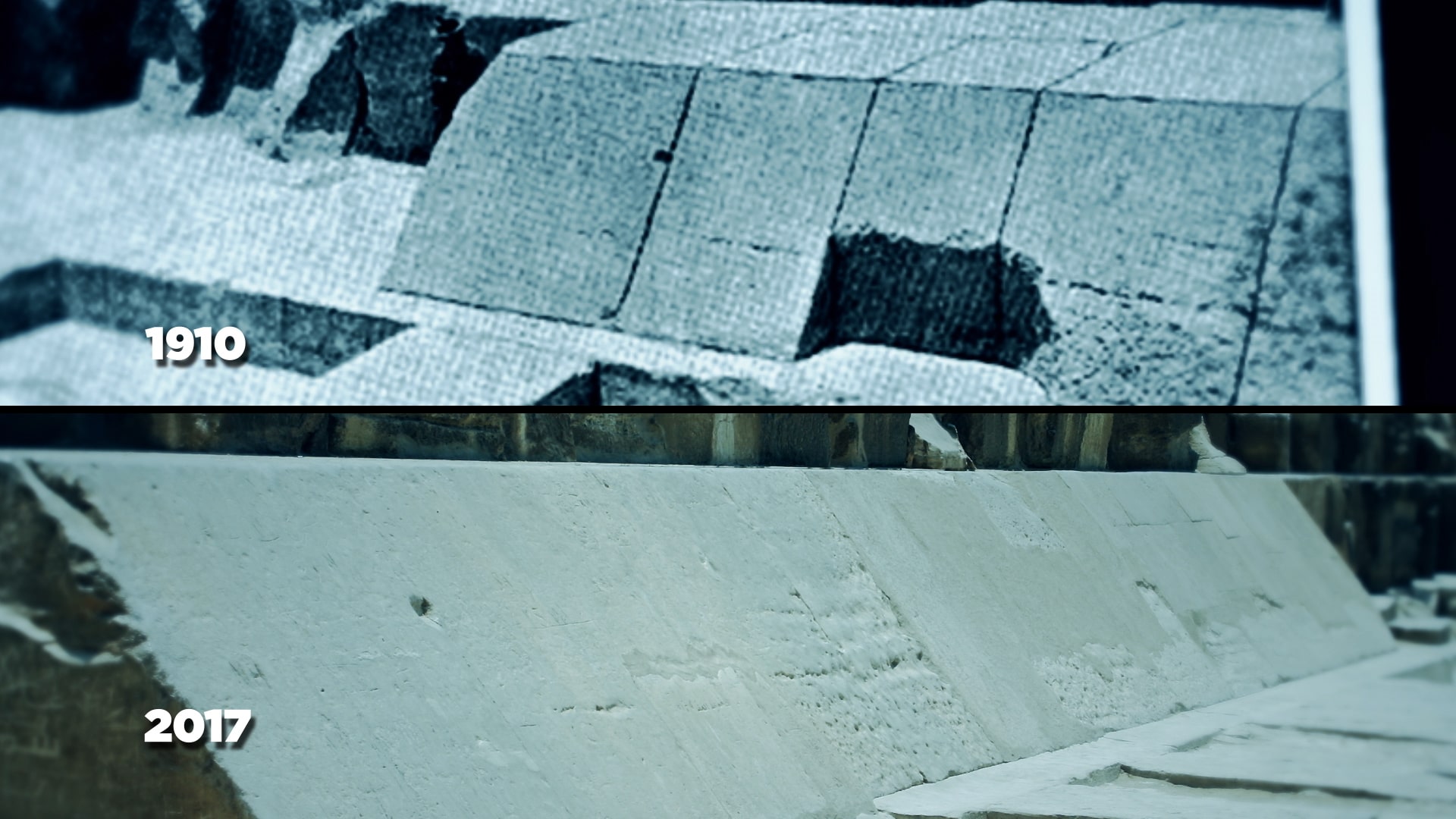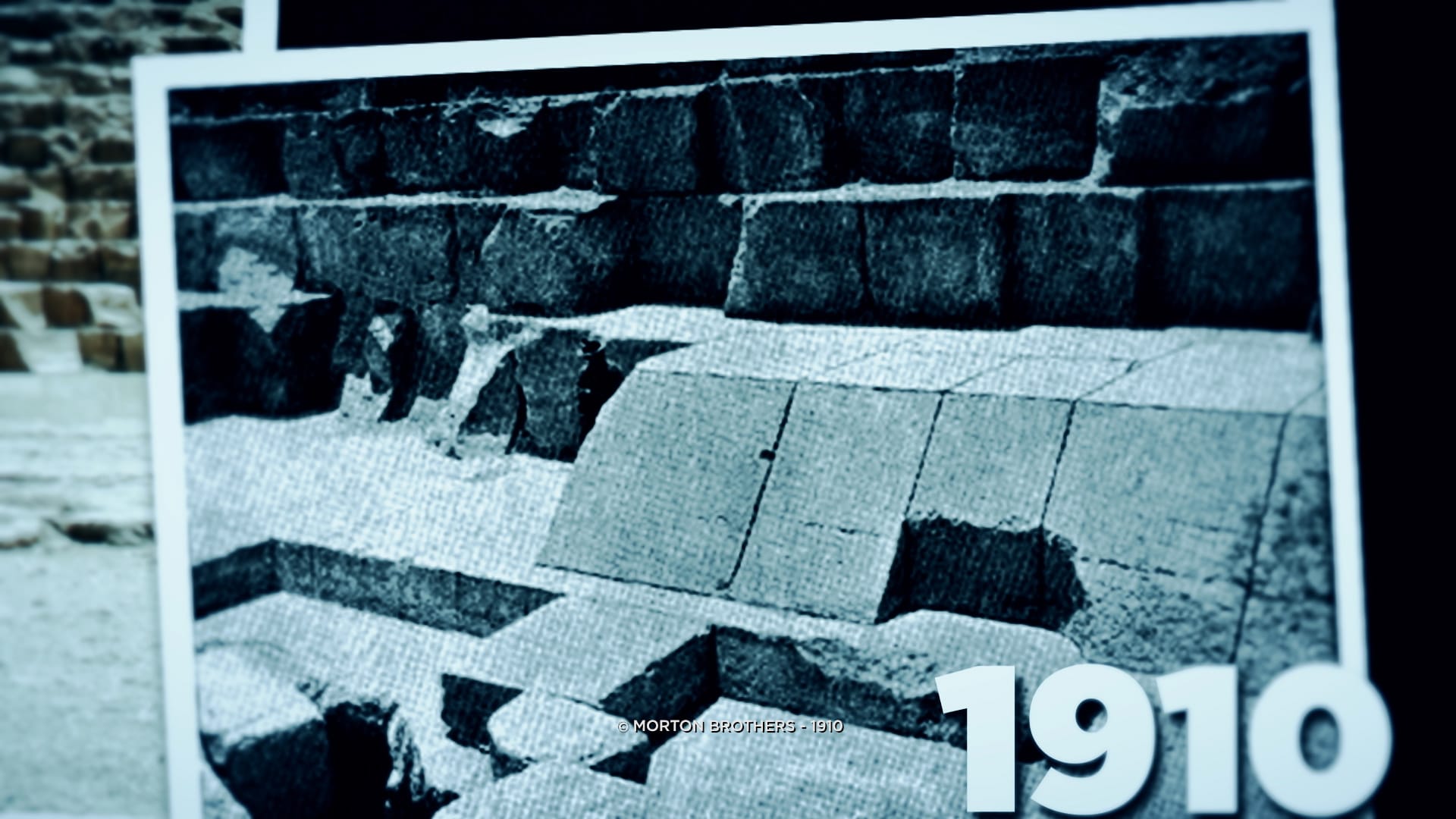 Pour affirmer que le parement de la Grande Pyramide aurait de tout évidence été plan, certains s’appuient sur quelques blocs visibles sur la face nord de la Grande Pyramide, supposés être les derniers blocs en place du parement. Mais là encore, lorsque l’on se renseigne, on découvre que ce n’est très probablement pas le cas, car les voici photographiés en 1910 par les frères Morton.